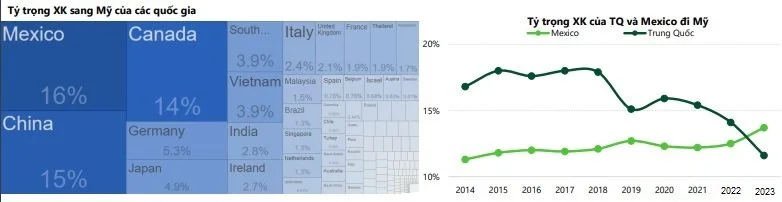 Thị phần hàng hóa của TQ XK sang Mỹ đã giảm mạnh từ 18% (2017) xuống còn 11% (2023). Trong các mặt hàng thì điện tử là lĩnh vực có mức giảm thị phần lớn nhất, từ gần 50% còn khoảng 30%. Việt Nam đã chứng kiến mức tăng đáng kể nhất về thị phần XK sang Mỹ. Tỷ trọng hàng VN XK đi Mỹ đã tăng hơn 2 lần từ 1,6% (2017) lên 3,9% trong 2023. Dự kiến tình trạng này sẽ kéo dài đến hết 2024 và nửa đầu 2025.