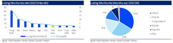Việt Nam nằm trong nước có mức tiêu thụ bia lớn nhất thế giới (2022), chiếm 2.7% toàn cầu. Tuy nhiên, mức độ tiêu thụ bia trên đầu người ở Việt Nam chỉ bằng 43% so với trung bình top 10 quốc gia