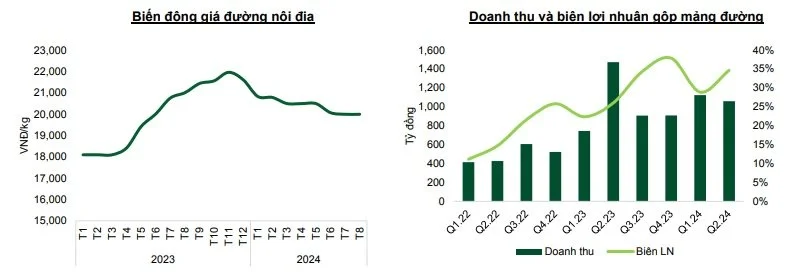 Mảng đường ghi nhận 1.060 tỷ VND (-28,1% YoY), chủ yếu do sự sụt giảm mạnh về sản lượng đầu ra, giảm -32,1% YoY so với quý 2 kỷ lục năm ngoái (84 nghìn tấn).