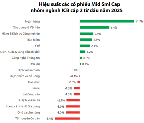 Nhóm cổ phiếu vốn hóa vừa và nhỏ dẫn dắt hiệu suất thị trường từ đầu năm: Dữ liệu từ biểu đồ hiệu suất chỉ số cho thấy VNMID tăng 0,94%, trong khi VNSML cũng duy trì mức tăng 0,80%, cao hơn đáng kể so với VN-Index chỉ tăng 0,05%. Đáng chú ý khi sự bứt phá của nhóm vốn hóa vừa và nhỏ bắt đầu cùng với mùa báo cáo kết quả kinh doanh.