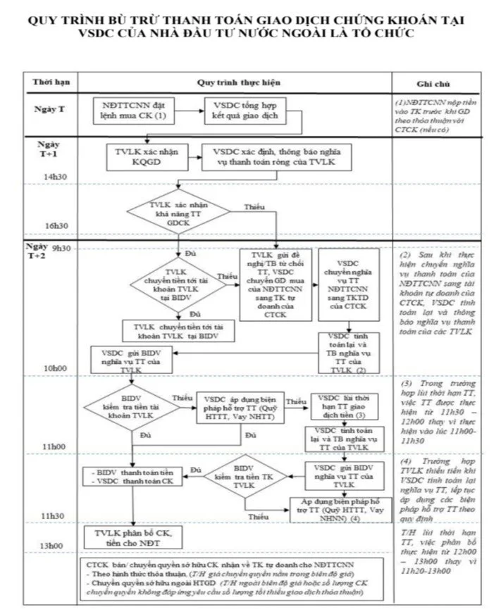 Trường hợp nhà đầu tư nước ngoài là tổ chức đặt lệnh mua cổ phiếu không thực hiện thanh toán đủ theo quy định Tổng công ty Lưu ký và Bù trừ chứng khoán Việt Nam thực hiện chuyển nghĩa vụ thanh toán tiền giao dịch mua cổ phiếu còn lại của nhà đầu tư nước ngoài là tổ chức thành nghĩa vụ của công ty chứng khoán nơi nhà đầu tư đặt lệnh mua cổ phiếu (qua tài khoản tự doanh của công ty chứng khoán) tại ngày thanh toán. Công ty chứng khoán phải đảm bảo đủ nguồn tiền để thanh toán cho giao dịch.